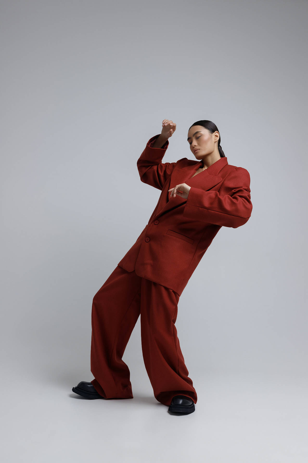 Шерстяная костюмная ткань премиум класса, которую мы заказывали в Италии. Сложно сконструированные гиперболизированные плечи. Лацканы и ворот выстроены в особенной пластике. Оверсайзный силуэт, и некоторая фундаментальность пиджака дополняются подвижностью, драпировкой и мягкой пластикой брюк палаццо.