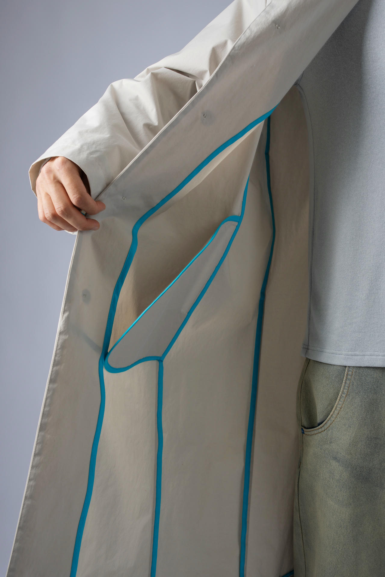 Ностальгический и ретрофутуристичный силуэт халата инженера научной станции 80-ых годов, высеченный из итальянского высокотехнологичного плащевого материала, высокой плотности переплетения.